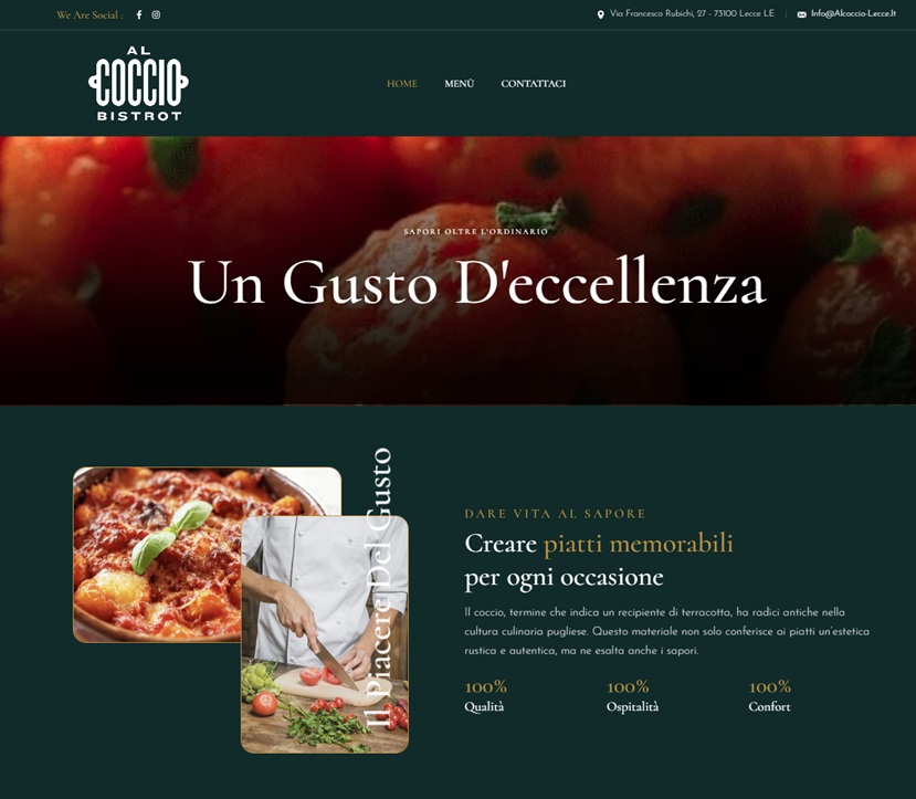 The Client Il ristorante Al Coccio di Lecce offre un menù tipico Pugliese Cosa abbiamo fatto MimosaBlu srl ha realizzato il nuovo sito del ristorante Al Coccio. Un sito completamente rinnovato nel design, più moderno, elegante e fruibile da ogni dispositivo! > Sviluppo Web > Grafica e Creatività > Social Media > Ottimizzazioen SEO > Consulenza